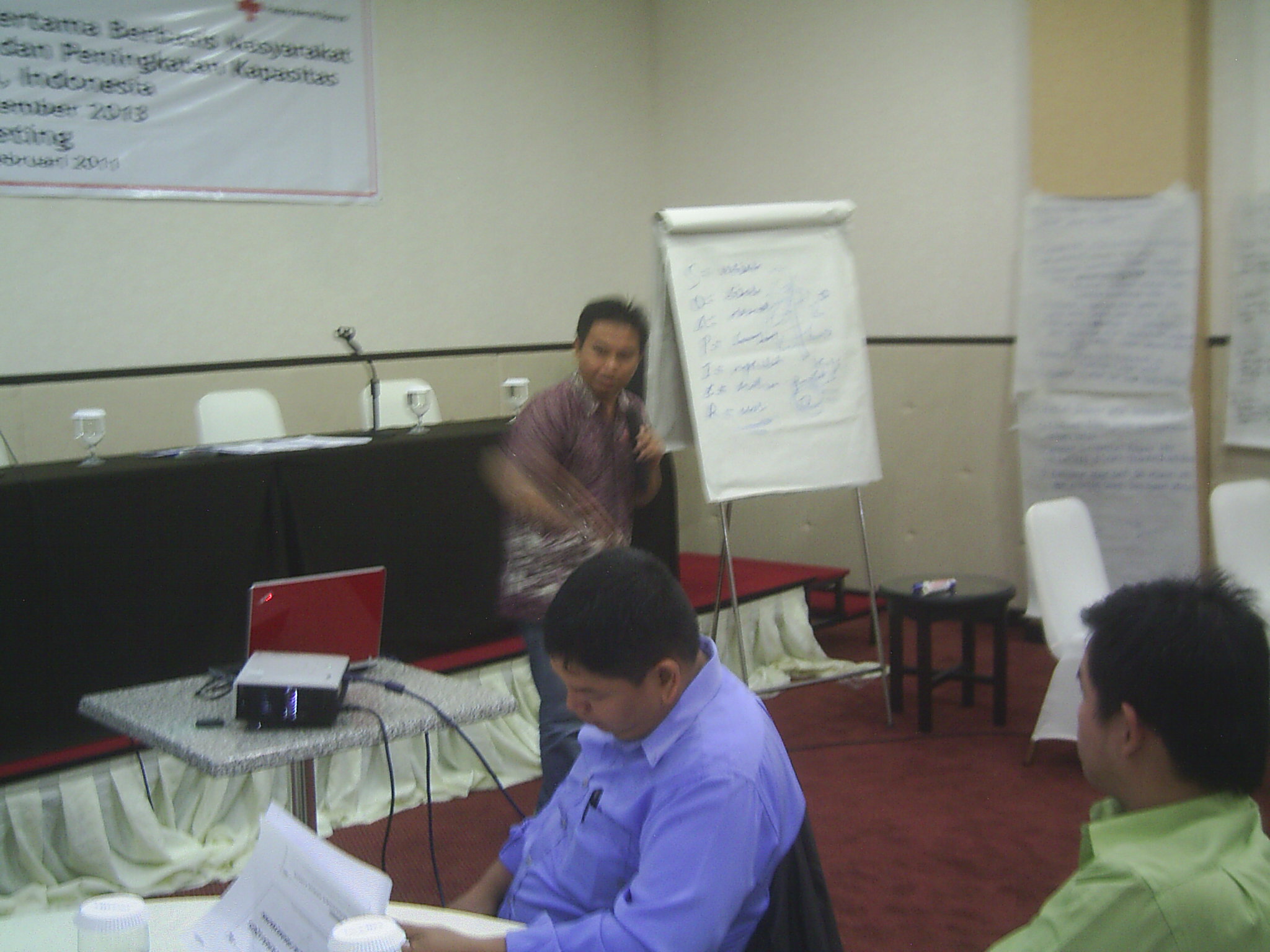 Pak Tri, dari Markas Pusat PMI, pada hari Sabtu, 19 Februari 2011, bertempat di Ruang Keruing, Hotel Luwansa, menyampaikan dasar berpikir mengenai kerangka kerja logis. Dimulai dari tujuan umum yang merupakan mimpi yang ingin dicapai dari suatu program. Dilanjutkan dengan tujuan khusus yang merupakan bentuk yang lebih membumi dari tujuan umum. Dilanjutkan dengan output yang diinginkan dari masing-masing tujuan khusus. Kemudian berbagai kegiatan yang berguna untuk mewujudkan masing-masing output. Dari kerangka berpikir ini kita diharapkan bisa mengerti cara berpikir dari program ini secara utuh.