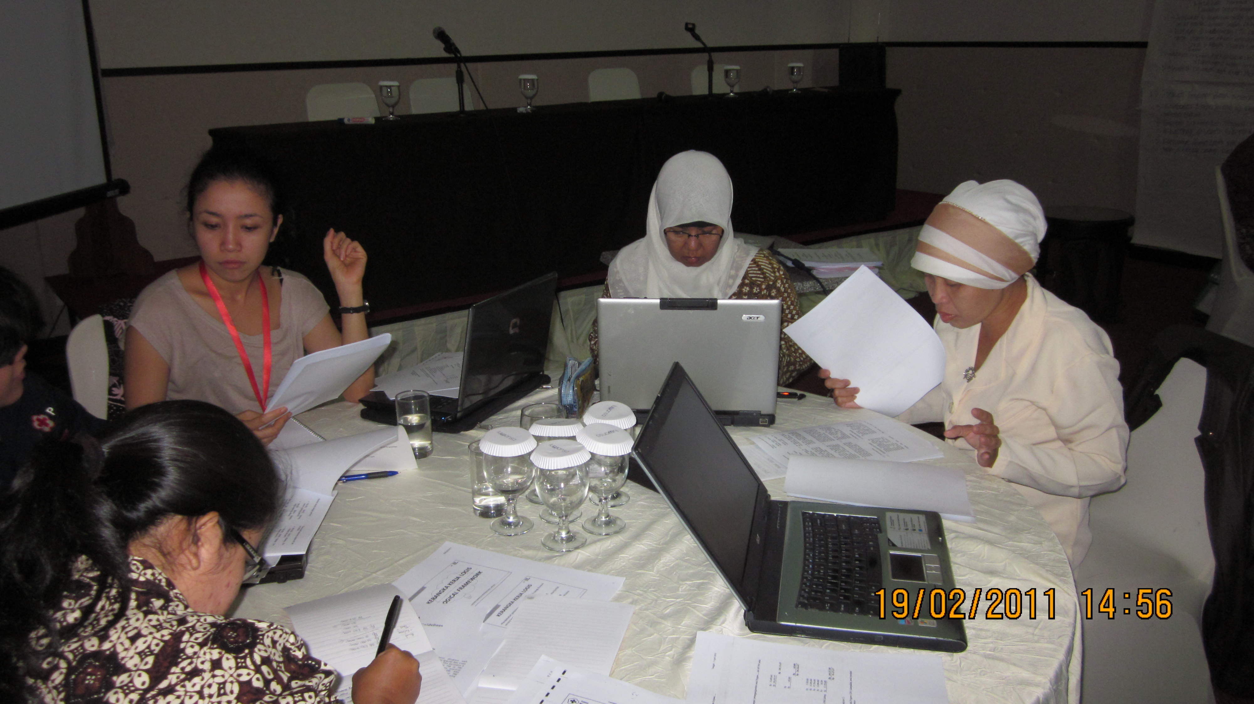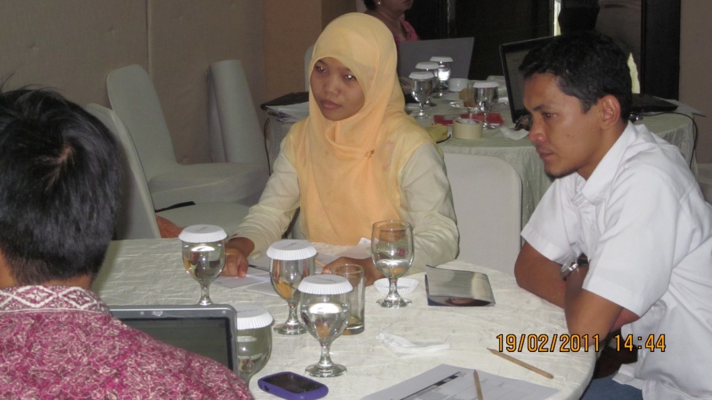 Masing-masing kelompok terdiri dari staf tingkat kabupaten, provinsi, pusat serta dari pihak Palang Merah Spanyol. Diskusi membicarakan mengenai deskripsi kerja dari masing-masing staf, perencanaan untuk tiga bulan kedepan, kemudian membicarakan tentang masalah monitoring, evaluasi, pelaporan serta pemberian dokumen dari masing-masing bidang kepada para staf.