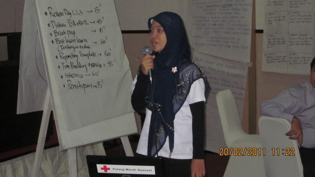 Setelah berdiskusi sekitar 45 menit (lanjutan kemarin), masing-masing staf kabupaten dan provinsi diminta untuk menyajikan hasil diskusi sejak kemarin sampai pagi ini. Penyajian POA dari masing-masing bidang ini masih sangat kasar, mengingat cukup banyak kegiatan yang tidak tercantum dalam POA tapi sudah ada dalam budget (anggarannya).