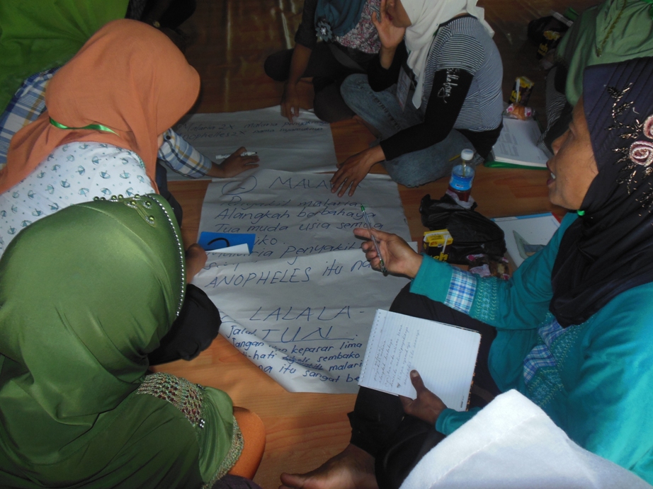 Fasilitator juga memberikan kesempatan kepada relawan desa untuk membuat sendiri hasil karya berupa sebuah lagu dan pantun yang masih bertemakan penyakit malaria dengan waktu yang telah ditentukan.Secara berkelompok relawan desa membuat suatu tulisan yang bertemakan lirik-lirik lagu dan pantun yang akan dipersentasikan dihadapan fasilitator dan relawan desa lainnya.