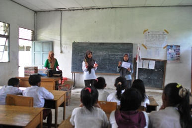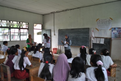 Relawan PMI menyampaikan materi dan simulasi cara menggosok gigi yang baik dan benar untuk murid kelas lima dan enam. Selanjutnya, murid kelas lima dan enam akan mempraktekkan sendiri cara menggosok gigi kepada adik kelasnya yaitu kelas satu sampai kelas empat.
