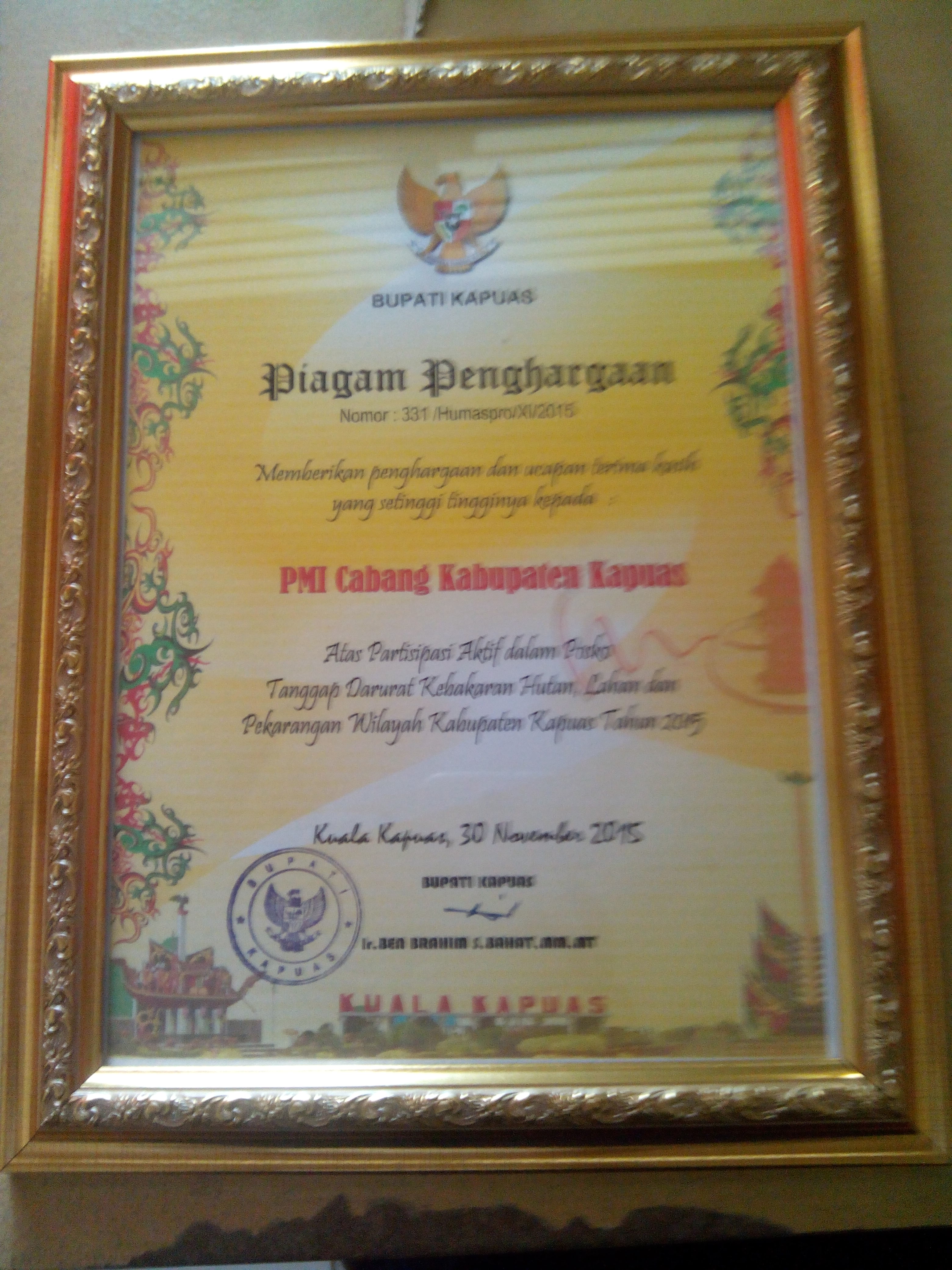 Pada acara tersebut juga sekaligus pemberiaan penghargaan kepada tim posko tanggap darurat kebakaran hutan dan lahan, salah satunya PMI Kabupaten Kapuas yang juga menerima penghargaan tersebut.