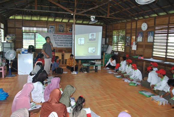 Relawan kelurahan mendapatkan Pelatihan yang bertopik tentang Pertolongan di Air dan di Darat. Materi yang diberikan berisi :