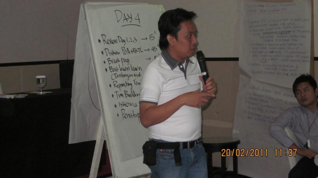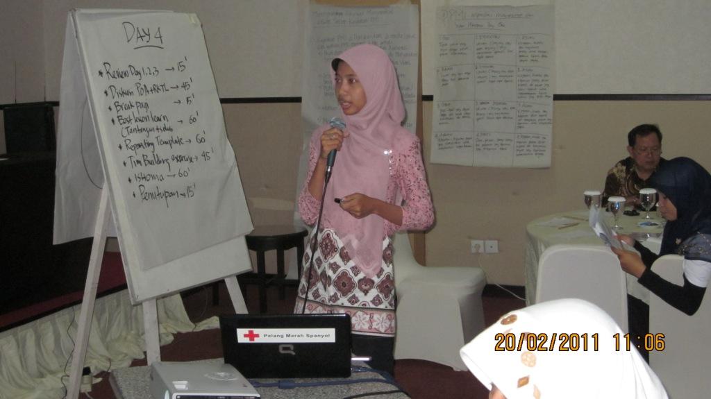 Menindaklanjuti hasil pertemuan pembukaan (start up meeting) di Palangka, 17-20 Februari 2011, maka pada hari ini para staf markas membereskan meja-meja mereka untuk mengosongkan satu dari tiga ruangan yang dimiliki. Satu ruangan yang dikosongkan ini akan digunakan untuk rapat-rapat staf markas dan dapat juga digunakan sebagai ruang pertemuan dengan para relawan. Selain membereskan ruangan, para staf juga merakit meja komputer berikut dengan komputernya yang merupakan bantuan dari Palang Merah Spanyol. Berikut ini adalah penanggung jawab dari masing-masing peralatan yang merupakan bantuan dari Palang Merah Spanyol untuk mendukung tugas-tugas para staf markas:
